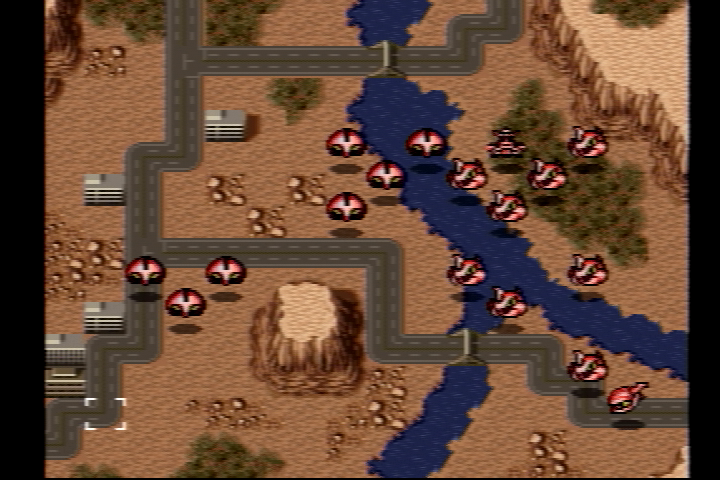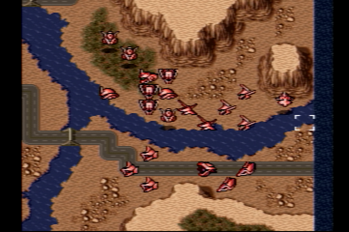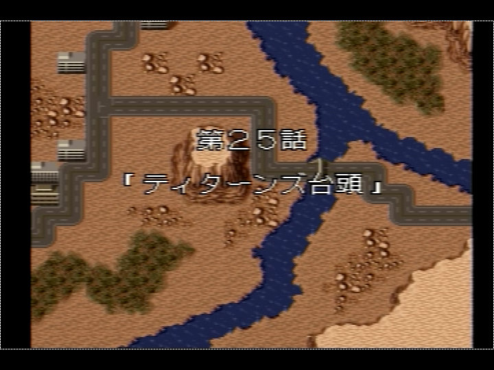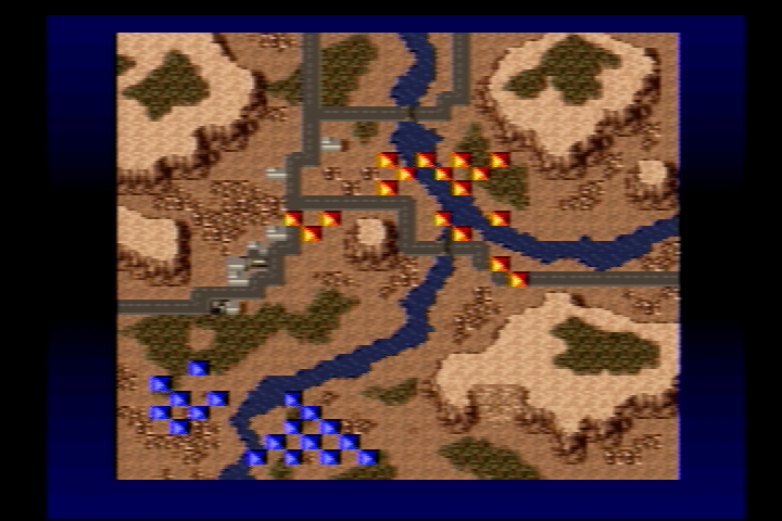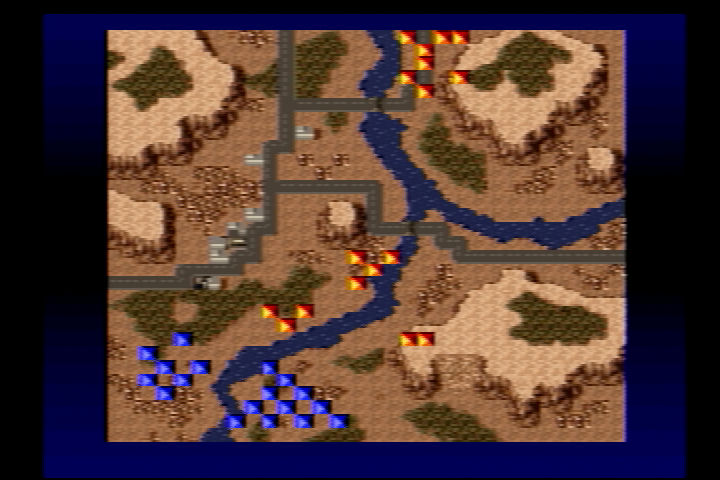 1ターン目終了直後のマップ。ウィル=ウィプスが画面端に到達すると(つまり敵軍2ターン目)、アレンとフェイを残して他は全部撤退します。少しでも稼ぎたいなら飛行ユニット、特にサーバインズワウスを向かわせて倒せるだけ倒しましょう。シナリオ開始前にブースターで移動力アップしておくとなおよし。ビルバインは倒してしまってかまいません。