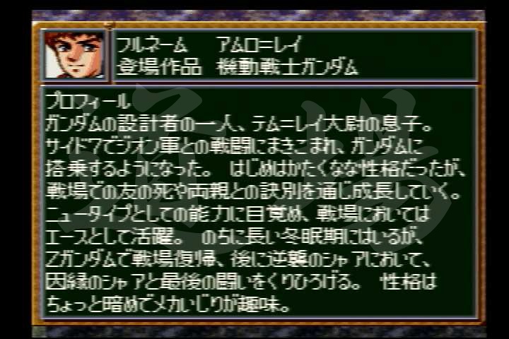 | 加入時はレベル5で、これは周りよりもかなり低い。精神コマンドは無難なので、育てるなら後半のチームが分かれる前に、幸運持ちと組ませてスーパーガンダムに搭乗させよう。 |