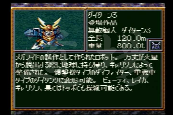 【PS】ダイターン3 | HP | EN | タイプ | 移動力 | 運動性 | 装甲 | 限界 |