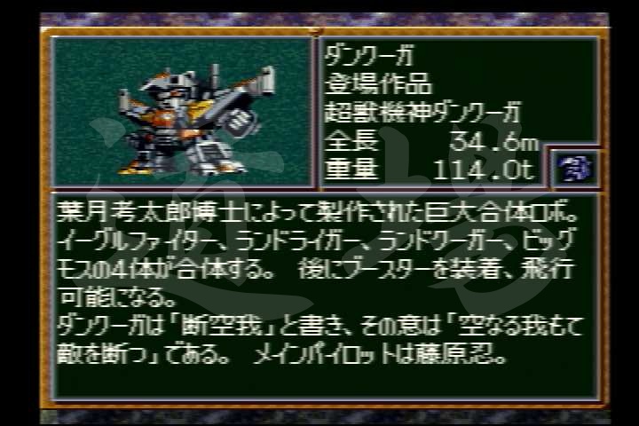 ![]() 【PS】ダンクーガ | HP | EN | タイプ | 移動力 | 運動性 | 装甲 | 限界 |