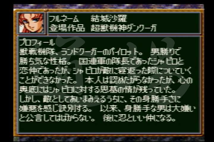 | PS移植にあたって加速が魂になった。それにより鈍足感が増した。獣戦機隊は4人全員が熱血持ちだが、一人くらい熱血じゃなくて加速を持っていても良かったのに。 |