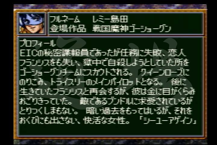 | ゴーショーグンチームの中では重要な精神コマンドが固まっている。特に序盤は精神ポイント切れを起こしがち。気合をキリーあたりが持っていればよかった。 |