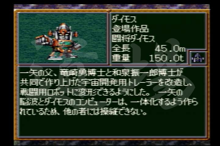 ![]() 【SFC】ダイモス | HP | EN | タイプ | 移動力 | 運動性 | 装甲 | 限界 |