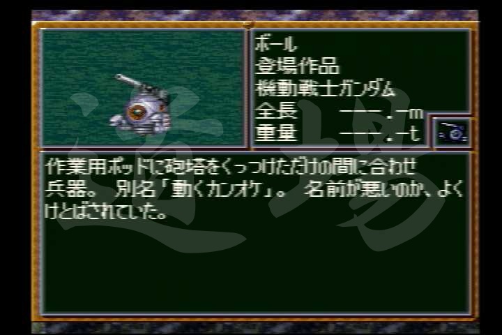 ![]() 【SFC】ボール | HP | EN | タイプ | 移動力 | 運動性 | 装甲 | 限界 |