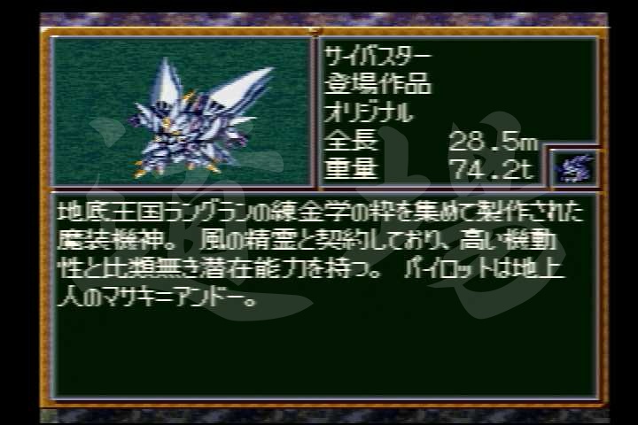 ![]() 【SFC】サイバスター | HP | EN | タイプ | 移動力 | 運動性 | 装甲 | 限界 |