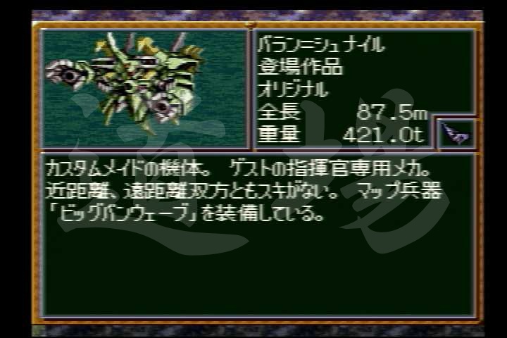 【SFC】バラン=シュナイル | HP | EN | タイプ | 移動力 | 運動性 | 装甲 | 限界 |
